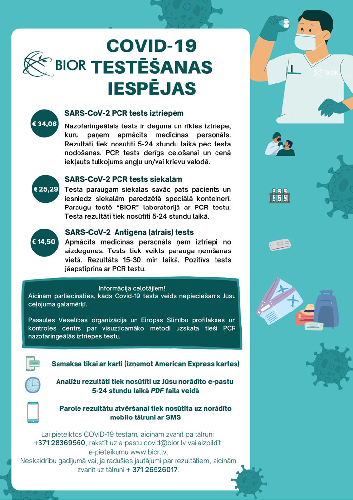 BIOR Covid-19 testēšanas punktā ir iespējams veikt sekojošus testus:
