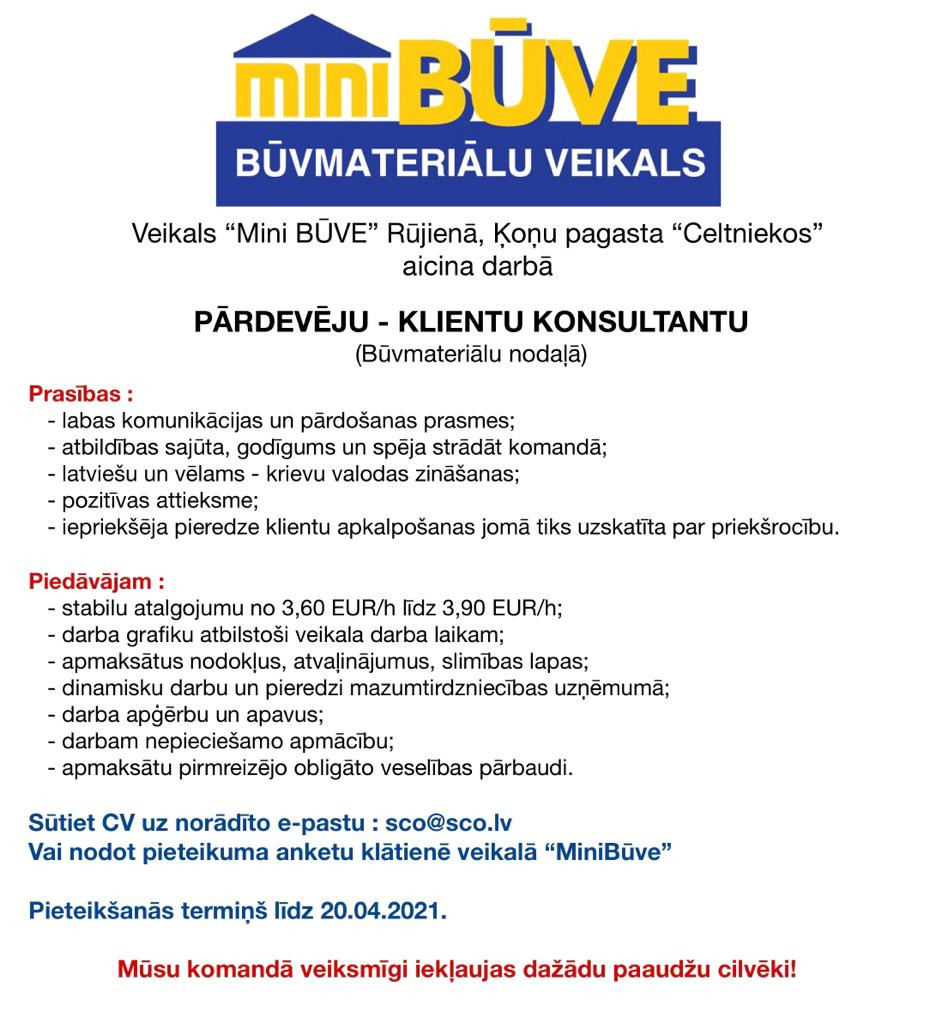 Veikals “Mini BŪVE” Rūjienā, Ķoņu pagasta “Celtniekos” aicina darbā PĀRDEVĒJU – KLIENTU KONSULTANTU (Būvmateriālu nodaļā)