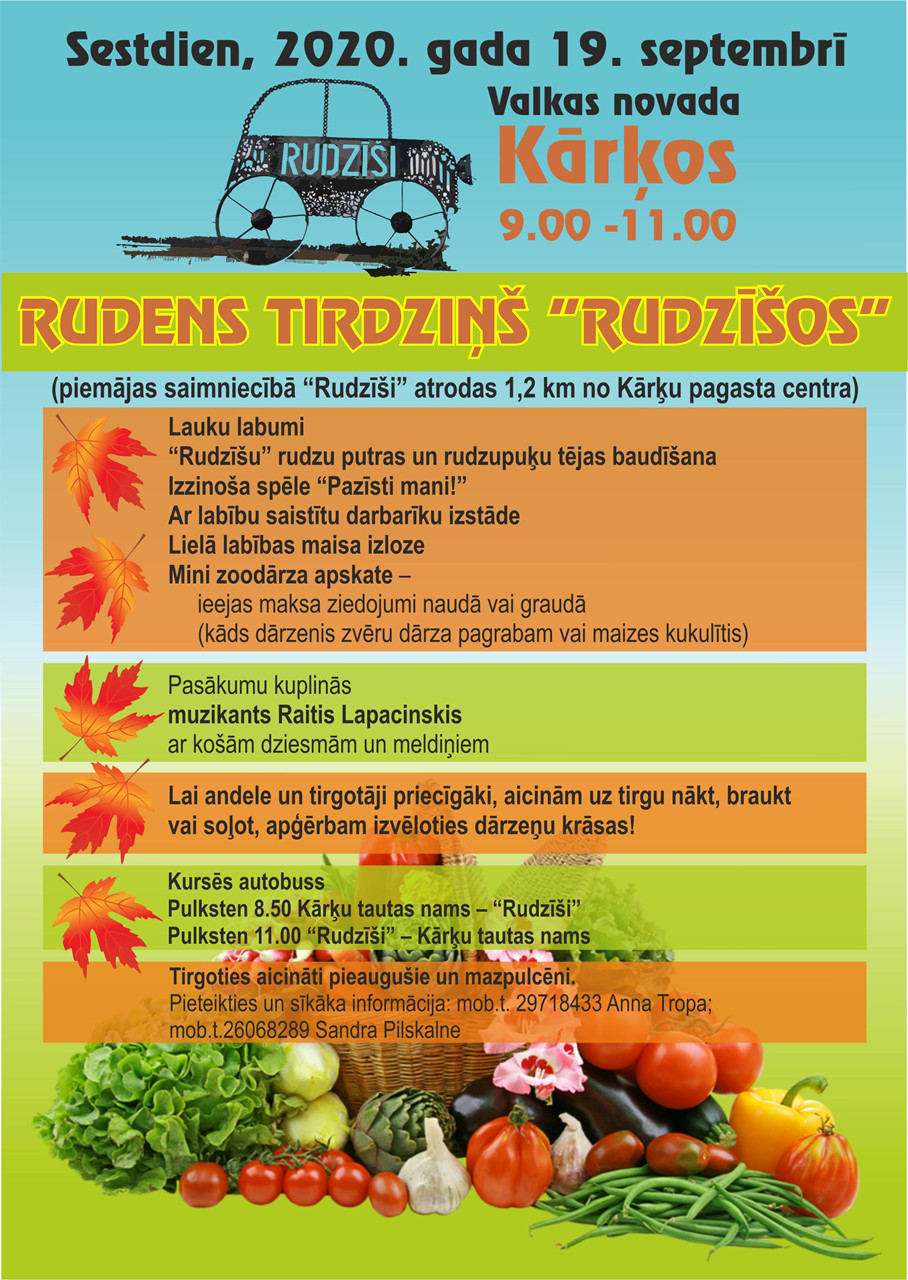 Sestdien, 19. septembrī no pulksten 9.00 līdz 11.00 Kārķu pagasta “Rudzīšos” notiks lauku labumu tirdziņš, kurā būs iespēja iegādāties dārza, meža un virtuves labumus, baudīt īstu lauku tirgus noskaņu.