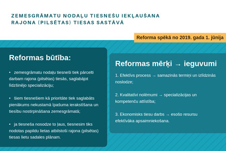 Saeima 2018. gada 25. oktobrī pieņēma likumu “Grozījumi likumā “Par tiesu varu””, kas paredz ar 2019. gada 1. jūniju īstenot rajona (pilsētas) tiesas zemesgrāmatu nodaļu tiesnešu integrēšanas rajona (pilsētas) tiesas sastāvā reformu. Tādējādi ar 2019. gada 1. jūniju zemesgrāmatu nodaļas kā patstāvīgas rajona (pilsētas) tiesas struktūrvienības tiks likvidētas un tiesību nostiprināšana būs piekritīga rajona (pilsētas) tiesai.