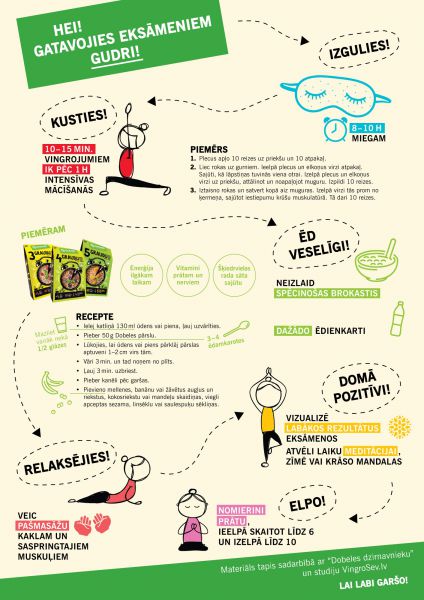 “Lai izturētu eksāmenu slodzi un nereti īsos termiņos iegaumētu lielu apjomu informācijas, būtiskākā ir cilvēka labsajūta. Ja it visā ievēro mērenību, tad arī rezultāti neizpaliks. Ilgtermiņā cenšoties iegūt laiku uz veselības rēķina – apdalot sevi ar miegu, izlaižot fiziskas aktivitātes un ēdienreizes –, jaunietis riskē ar nogurumu, stresa pieaugumu un atmiņas pasliktināšanos. Paradoksālā kārtā cilvēks neiegūs papildu laiku,” saka E. Deičmane. “Panākumu atslēga ir saplānota diena, kurā atvēlēts laiks kā mācībām, tā regulārām ēdienreizēm un atpūtai.”
