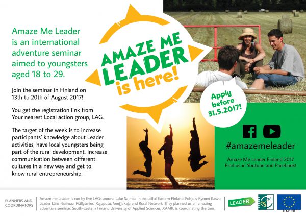 Jaunieši (18-29 gadi) no lauku teritorijām tiek aicināti piedalīties piedzīvojumu seminārā "Amaze me LEADER", kas no 13.-20. augustam notiks Dienvidu Somijā pie Saeimas ezera.Pasākuma mērķis ir iesaistīt jauniešus vietējo rīcības grupu darbā un veidot sadarbības saiknes starp jauniešiem Eiropas lauku teritorijās.