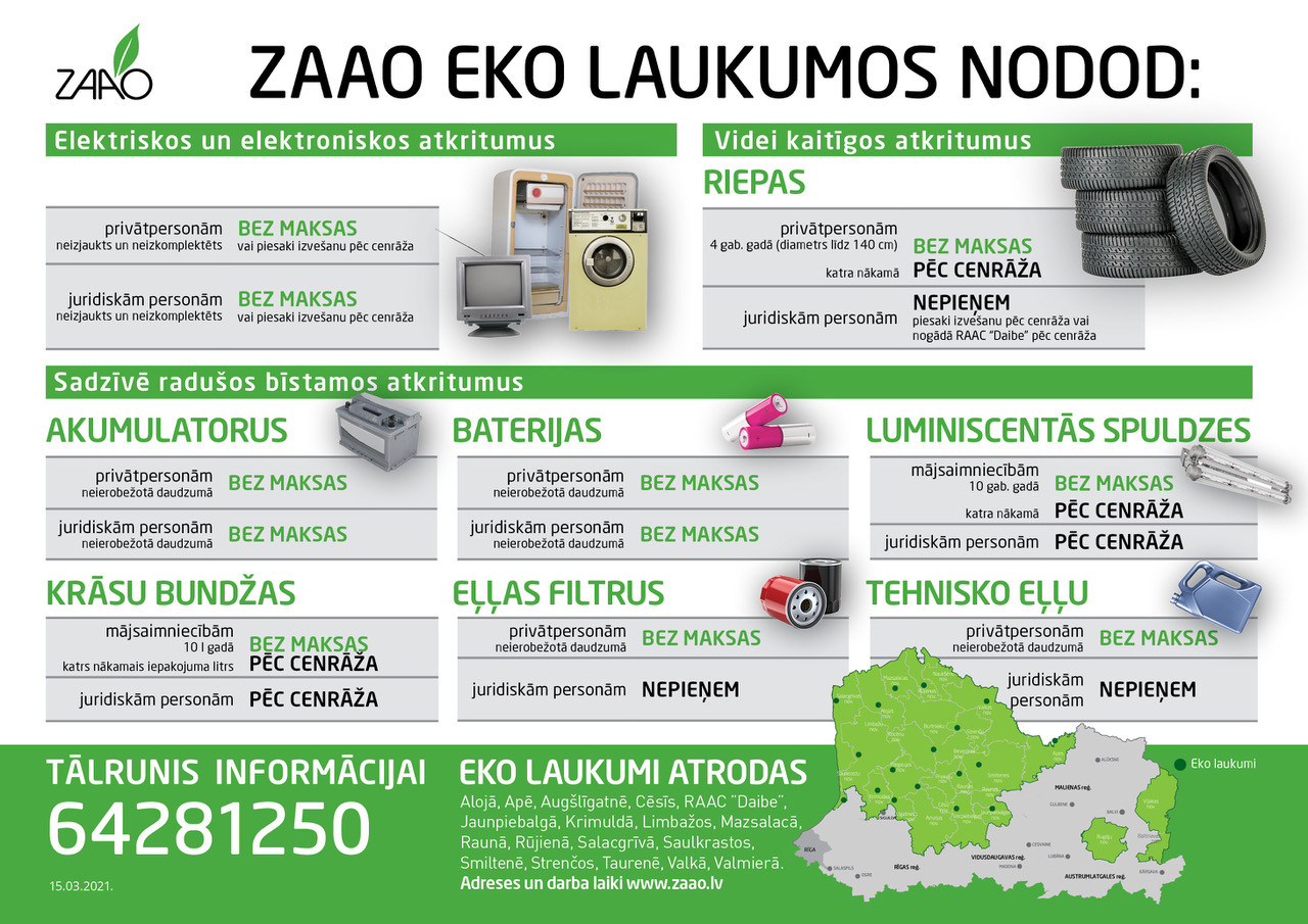 No 1. līdz 31.maijam notiks SIA “ZAAO” (ZAAO) organizēta akcija “EKO ZVANS!”, kuras laikā zvanot uz ZAAO biroju var pieteikt neizjauktas nolietotas elektrotehnikas bezmaksas savākšanu (iekārtas izmērs vismaz 60 x 40 x 40 cm). Pakalpojums tiks sniegts, izbraucot uz klienta norādīto adresi, iepriekš vienojoties par savākšanas dienu. Akcija ir spēkā tikai ZAAO darbības reģionā – 28 novados. Arī ikdienā ZAAO piedāvā minēto pakalpojumu, taču maijā ir iespēja laimēt iRobot. Akcijas laikā nolietotā elektrotehnika bez maksas tiks vākta arī no juridiskām personām, izsniedzot pieņemšanas – nodošanas aktu.ZAAO izsludina akciju lauksaimniekiem “Tīra sēta – laba sēta”