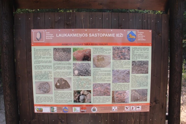 Visitors may familiarize themselves with interesting stones that can be found on the Koņi Hill as a result of receding of glacier. Stone informative trail is not long - only few hundred metres - from the area designated for parking to the "Baltic Sea", and then from the north of "Botnija" Bay to the "Gulf of Riga". Such exposition, using a model of the Baltic Sea is unique. A collection of 50 stones placed in the right areas of their origin is scientific enough and provides an opportunity for the visitors to gain one-of-a kind knowledge.
