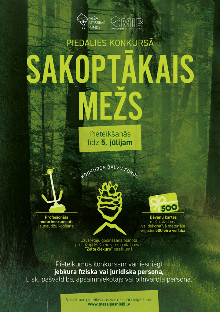 Latvijas Meža īpašnieku biedrība piekto gadu pēc kārtas organizē konkursu „Sakoptākais mežs”. Ar konkursa palīdzību vēlamies apzināt un izcelt labas mežsaimniecības prakses piemērus privātajos mežos, sniegt iespēju meža īpašniekiem dalīties savā pieredzē, attīstīt ilgtspējīgu meža apsaimniekošanu un veicināt sabiedrības izpratni par lauku kultūrvides saglabāšanu.