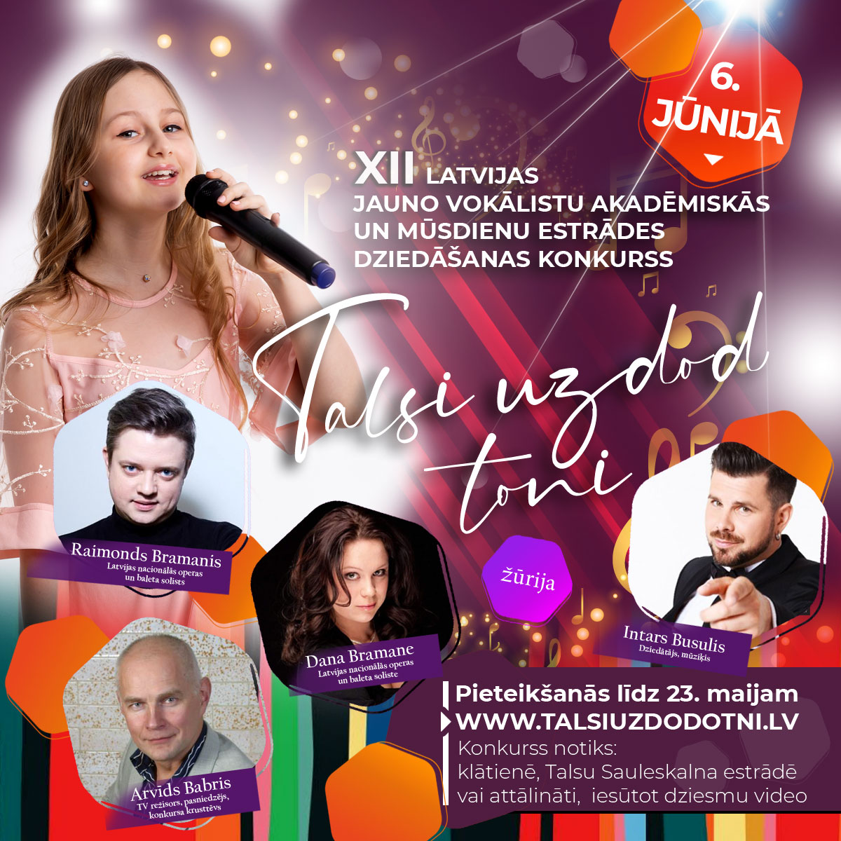 6.jūnijā aicinām piedalīties XII Latvijas jauno vokālistu akadēmiskās un mūsdienu estrādes dziedāšanas konkursā „TALSI UZDOD TONI 2021”!