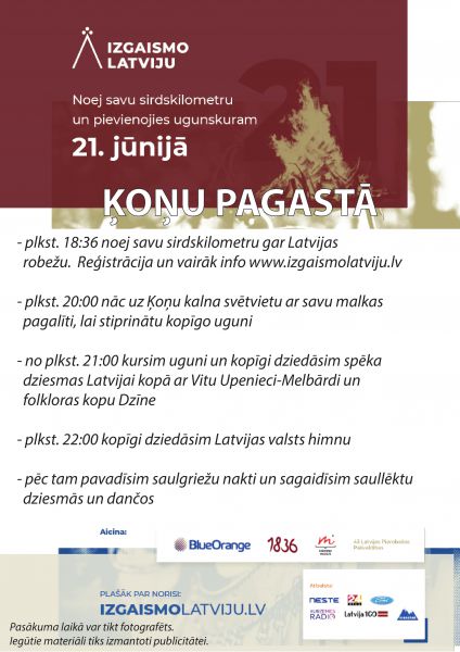 Šogad 21. jūnijā kopā ar biedrību 1836 plkst.18:36 aicinām noiet savu sirdskilometru uz Latvijas robežas. Vari gan pieteikties par brīvprātīgo www.izgaismolatviju.lv un atzīmēt konkrētu kilometru, kuru iesi, vai arī vienkārši noiet jebkuru sev mīļu kilometru (vai vairāk) nereģistrējoties.