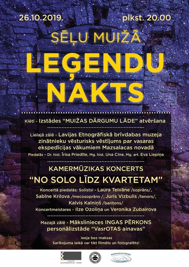 Sestdien, 26. oktobrī, plkst.20.00 Sēļu muiža aicina ikvienu mazliet pasapņot, jo Leģendu naktī atvērsies muižas dārgumu lāde un izskanēs kamermūzikas koncerts “No solo līdz kvartetam”.